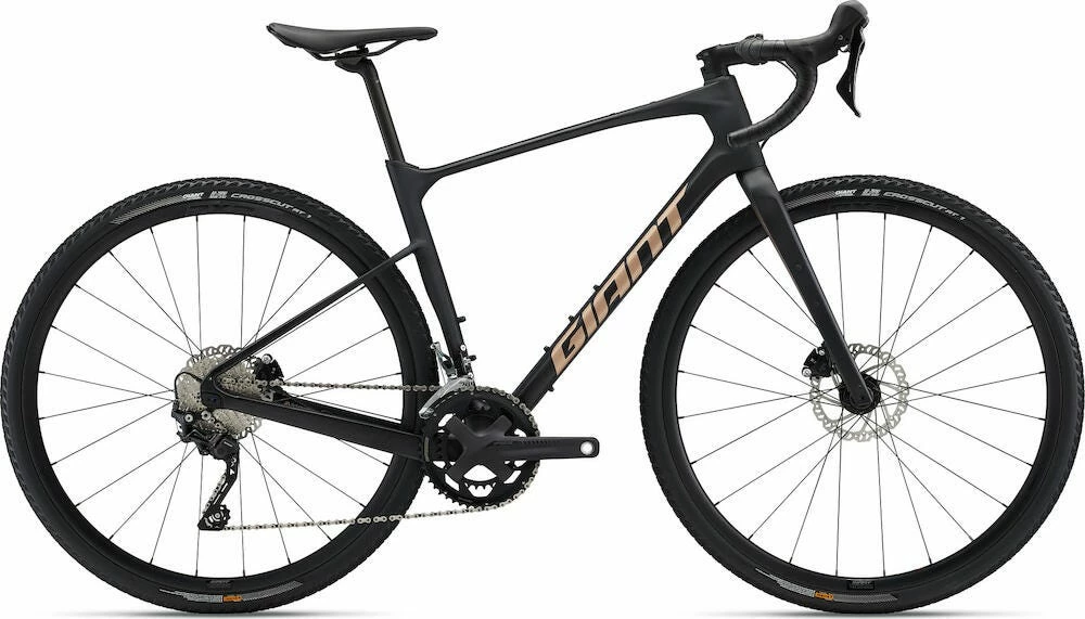 Le montage Revolt Advanced 3 possède un cadre en carbone avec le groupe de transmission spécifique au gravier Shimano GRX RX400 2×10 vitesses avec cassette 11-34 et freins à disques hydrauliques.
